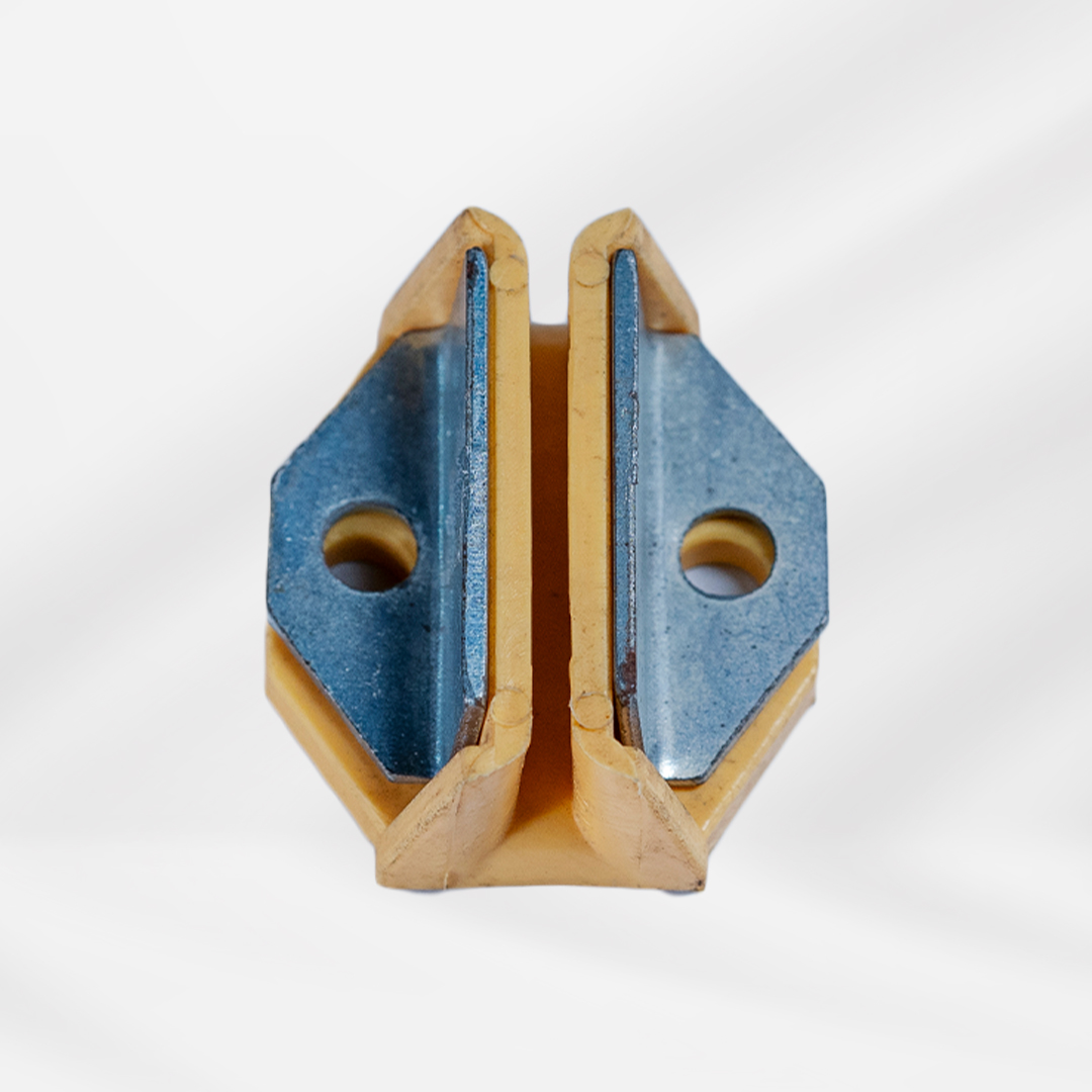 Heavy-duty guide shoe for precise car alignment and sliding performance on rails.